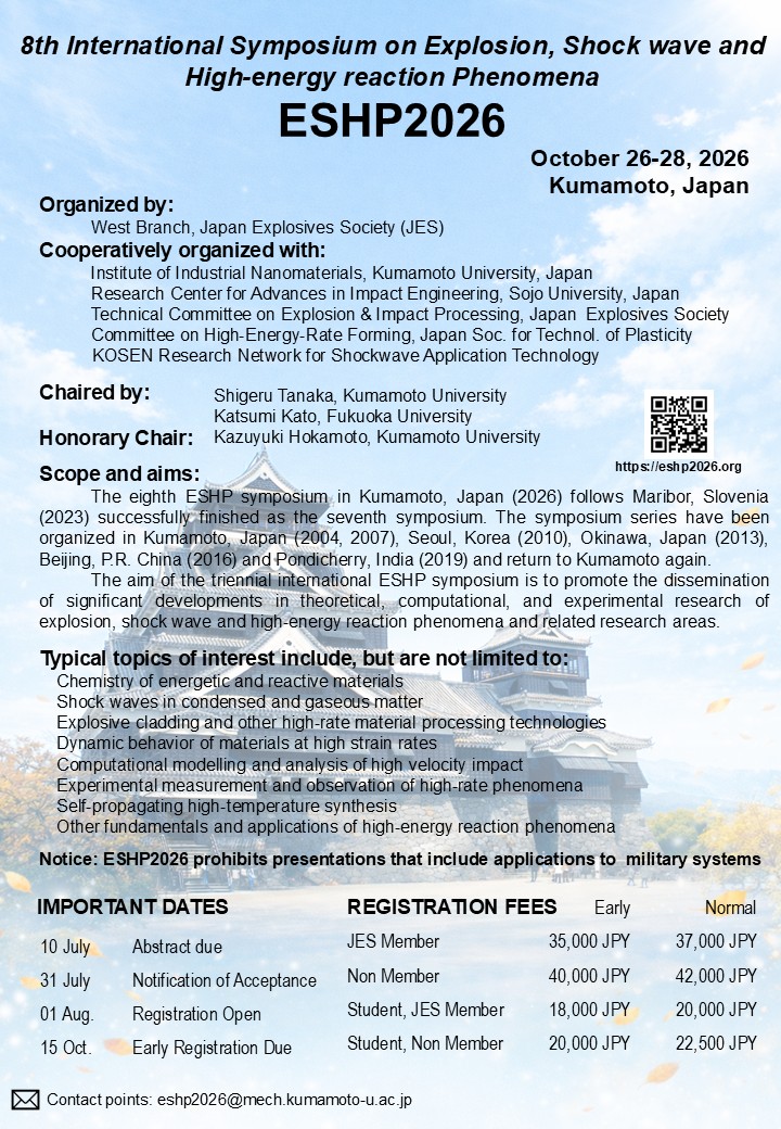 It is hereby announced that the 8th International Symposium on Explosion, Shock wave and High-energy reaction Phenomena (ESHP2026) will be held in Kumamoto, Japan, from Monday, October 26 to Wednesday, October 28, 2026.